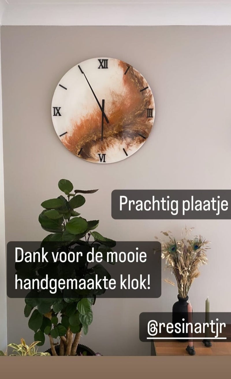 Wij hebben een unieke klok laten maken bij Resin Art JR en we zijn er super blij mee! Vanaf het eerste contact konden we zelf de kleuren uitkiezen, waardoor de klok precies past bij onze stijl en interieur.