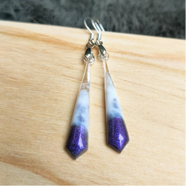 De oorbellen zijn gemaakt van hoogwaardige kwaliteit epoxy, zijn voorzien van zilveren haakjes en hebben de kleur wit en kameleon paars. De oorbellen zijn 3.5 cm (incl. haakje 5.5 cm).
