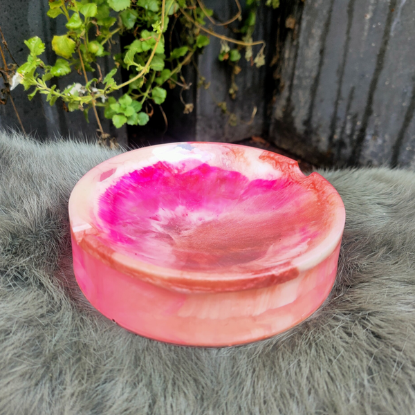 De asbak is gemaakt van hoogwaardige kwaliteit epoxy. De diameter van de asbak is 11 cm en de asbak is 2.8 cm hoog.