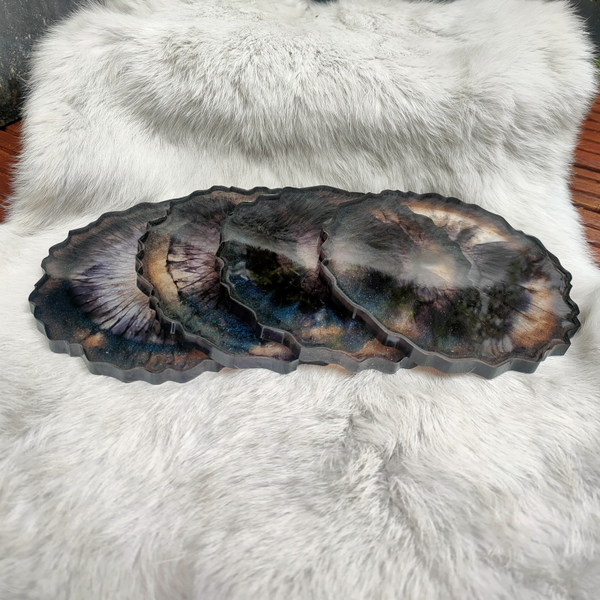 De onderzetters zijn gemaakt van hoogwaardige kwaliteit epoxy. De set bestaat uit vier onderzetters met een diameter van 12,5 cm. Kleuren die gebruikt zijn in deze set zijn zwart en kameleon. (Kameleon is een pigment waarbij er meerdere kleuren zichbaar zijn afhankelijk van hoe je op het voorwerp kijkt.)