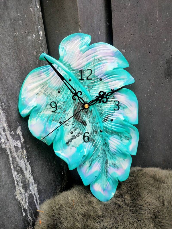 De klok is gemaakt in de vorm van een blad en heeft een 3D effect.